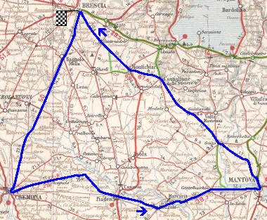 | Il circuito di Brescia sul percorso Brescia - Cremona Mantova - Brescia della Coppa che Vincenzo Florio mise in palio nella "Settimana di Brescia" del 1904. |