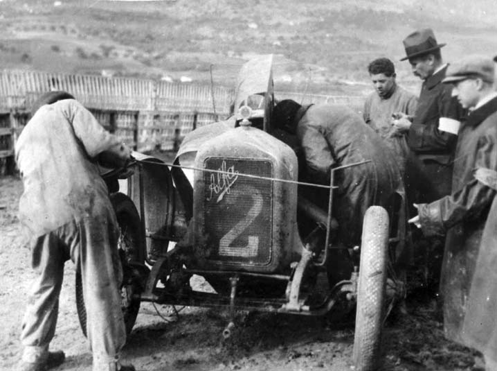 ![]() | La precedente edizione si era svolta in novembre, ma anche quell'anno (era il 20 ottobre) il tempo non fu clemente e la strada, trasformata in un mare di fango, costituì un banco di prova ancora più arduo per i 19 concorrenti. Fra i pochi che riuscirono a superare le avversità atmosferiche, prevalse Guido Meregalli che disponeva di una Nazzaro; la media superò di poco i 57 Kmh. A sette minuti dal vincitore si piazzò Enzo Ferrari con un'Alfa. Quell'anno al bivio di Cerda vennero costruite le prime tribune in muratura e gli spettatori vennero protetti da una doppia fila di eliche di idrovolante in legno concesse dalla Aeronautica Ducrot di Mondello la quale, a guerra finita, non le avrebbe più utilizzate. Nonostante gli sforzi e le idee originali di Florio, il giornalista milanese Lando Ferretti scrisse sulla Gazzetta che era assurdo disputare una gara su quelle strade e criticò l'organizzazione senza mezzi termini essendo rimasto impressionato dal percorso sconvolto dalla bufera. Vincenzo Florio si difese prontamente spiegando che Ferretti non aveva penetrato lo spirito pionieristico che la Targa avrebbe dovuto conservare sempre e che ne rappresentava la caratteristica. Ferretti capì e ne nacque una calda amicizia. |