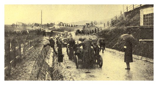 | In attesa del via sotto un diluvio. Poiché nessuno pensò a proteggere gli organi di accensione delle vetture vi furono numerosi ritiri. |