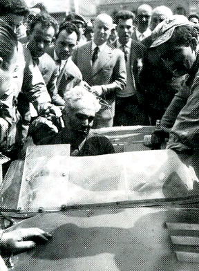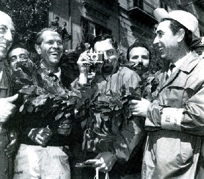 | Durante tutta la gara si registra un fantastico duello tra Piero Taruffi, questa volta alla guida di una Maserati 3 litri e il britannico Peter Collins su Ferrari 3500/4C. La spunta l’inglese che per batterlo deve realizzare la media record, mai raggiunta di 108 Km/h. Eccolo alla premiazione con uno spiritoso KLEMENTASKY.