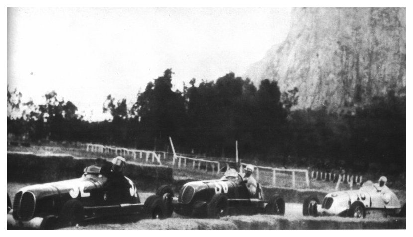 | ... si tallonano, si sorvegliano, si spiano, quasi come un fatto personale, anche perché corrono entrambi su Maserati. Il pubblico si appassiona ma al 24^ giro le due macchine si urtano, compromettendo la vittoria per entrambi. |