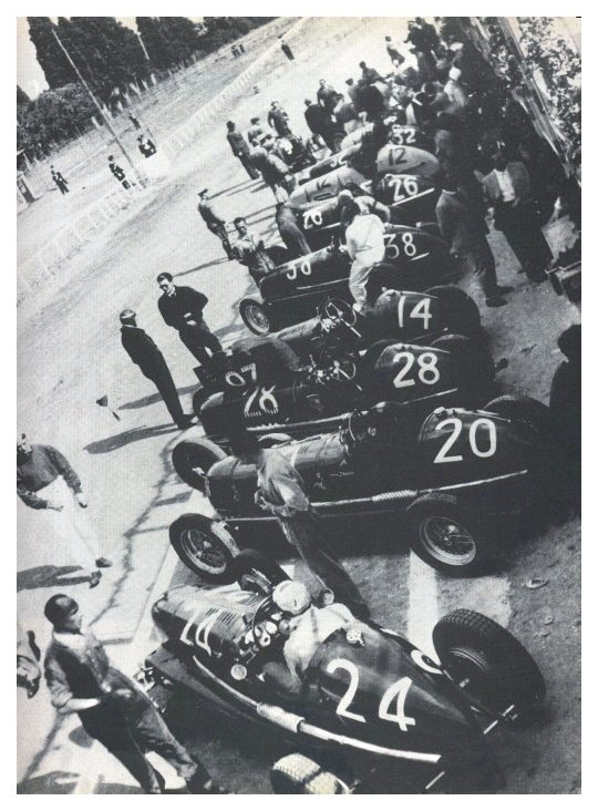 | Bella veduta dei box in primo piano le vetture di Cortese (24), PLATE' (20) Alberto Ascari (28) Romano (14) Barbieri (38) e del vincitore Villoresi (26) |
