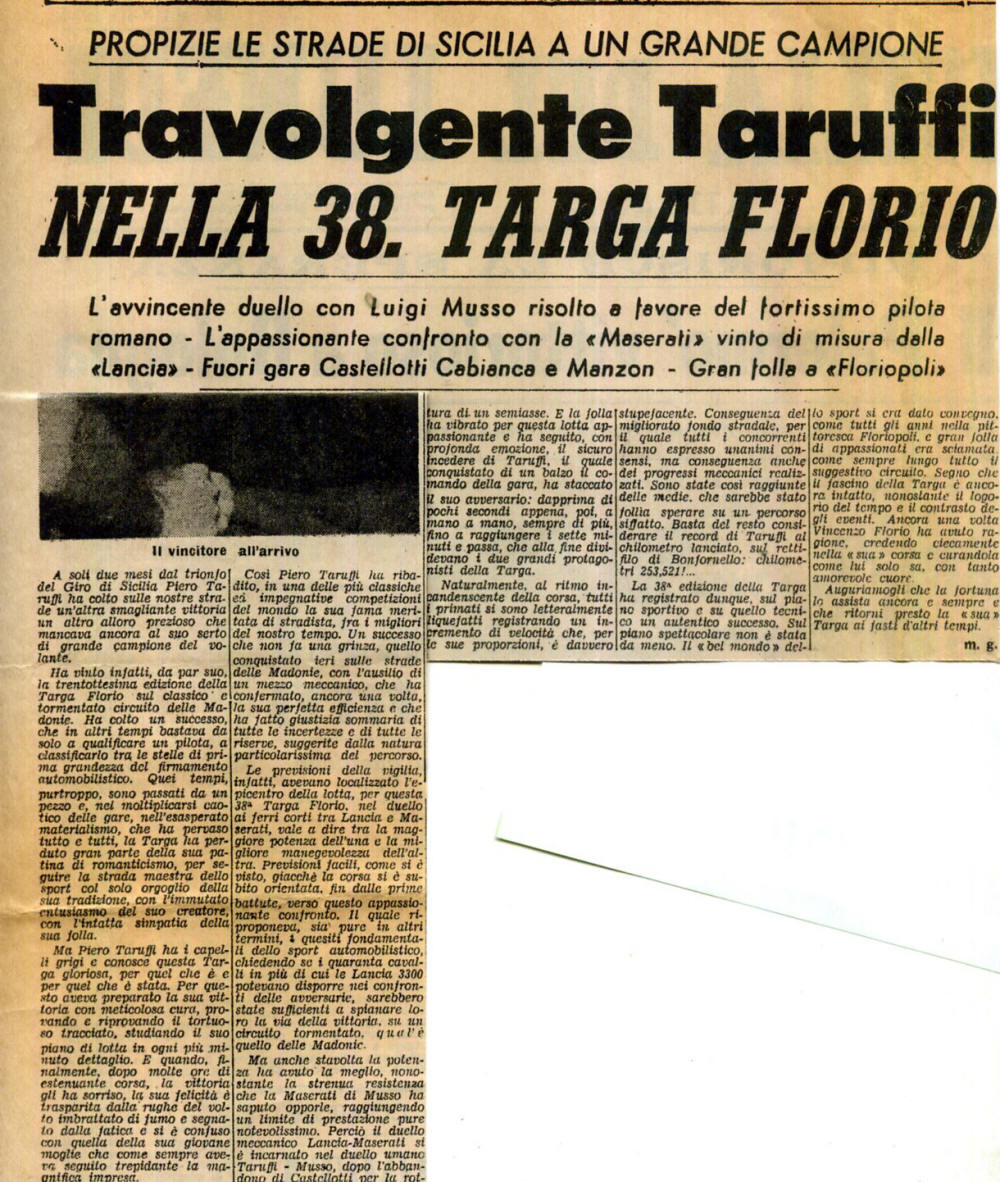 ![]() | Il grande duello, già previsto alla vigilia, vide di fronte la potente Lancia 3300 e la più agile Maserati 2000. Piero Taruffi, la già famosa « Volpe d'argento » e Luigi Musso, l'astro nascente dell'automobilismo italiano, che erano alla guida delle due macchine, umanizzarono il duello. A Taruffi però la vittoria non poteva più sfuggire e prevalse lui, alla media record di 89,630 Kmh che costituiva un incremento di velocità alquanto notevole nella storia del circuito delle Madonie. |