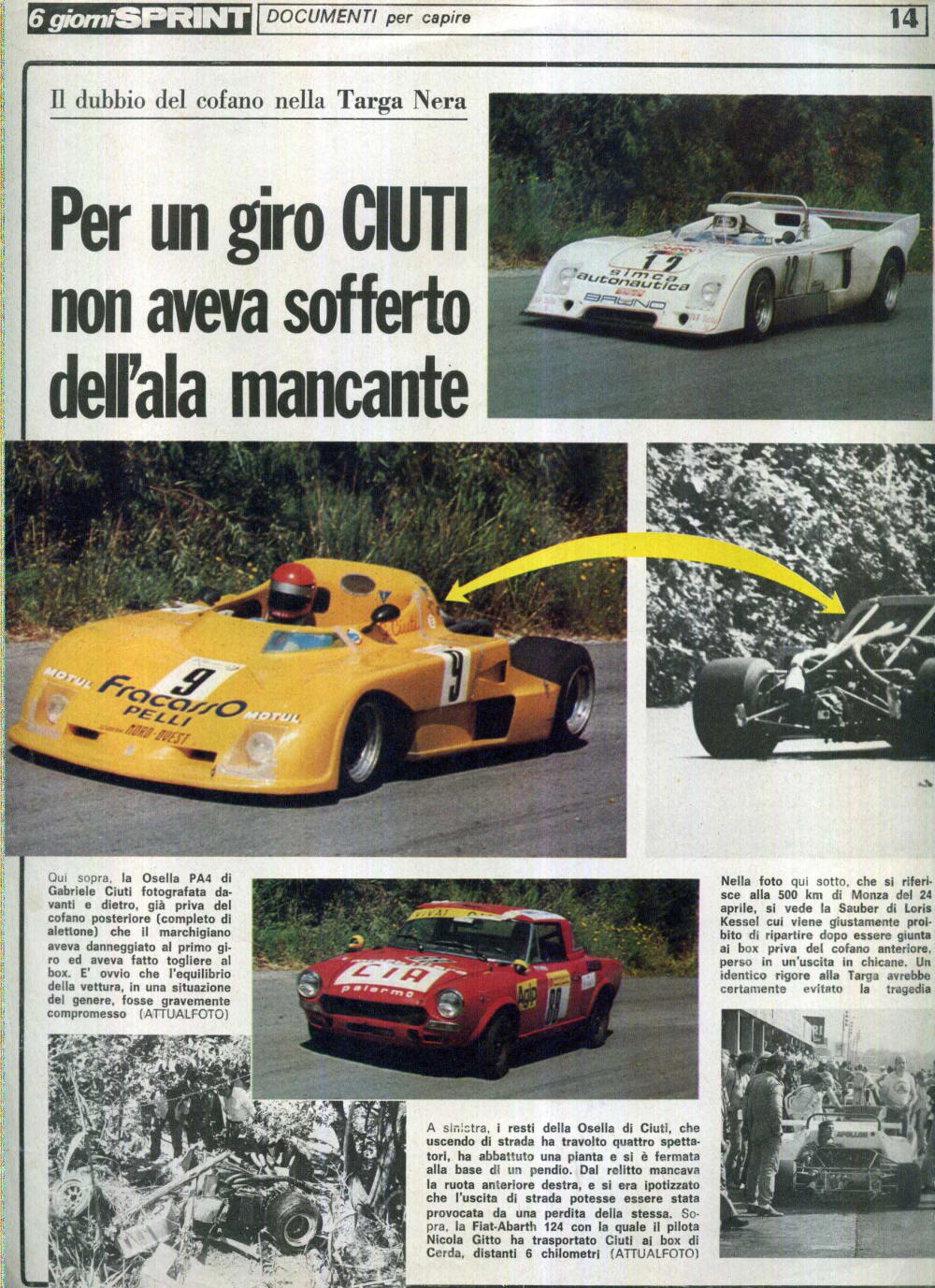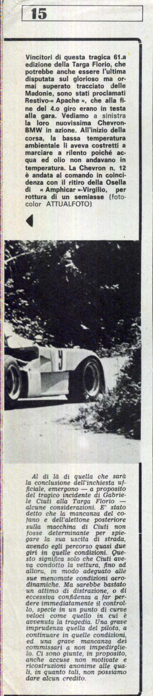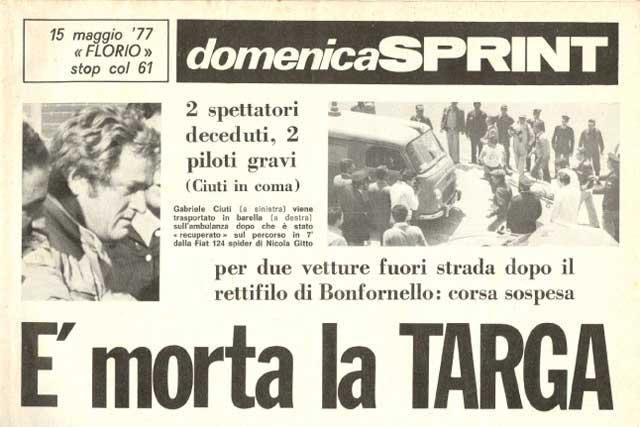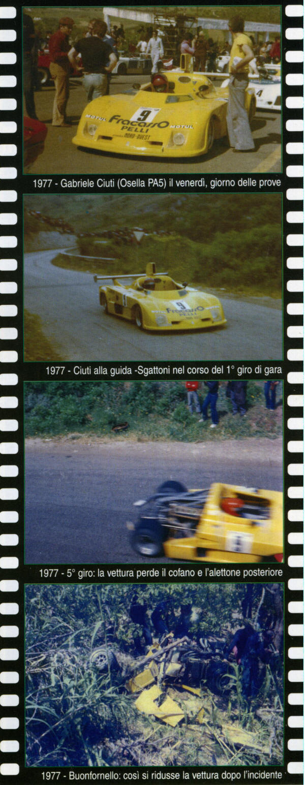 Cerda, domenica 15 maggio 1977. Le vetture stanno percorrendo il 5° giro del Piccolo Circuito delle Madonie; lungo i 72 km del tracciato di gara il pubblico vede sfrecciare una OSELLA PA5 di colore giallo col n. 9 di gara che prosegue la sua corsa nonostante non abbia più il cofano posteriore con l'alettone. Alla guida c'è Gabriele Ciuti... alla fine del rettilineo di Buonfornello c'è un curvone veloce a destra... il pilota vi arriva in pieno, ma in entrata di curva la sua auto si scompone, ne perde il controllo ' salendo su un terrapieno alla sinistra del curvone stesso; poi l'auto, ormai fuori controllo, punta verso il lato opposto della sede stradale finendo nella sua folle corsa per travolgere un gruppo di spettatori. Nell'incidente muoiono due persone, oltre ad alcuni feriti. Lo stesso Ciuti è in stato di coma, ma alla fine si salverà. A causa di questo triste episodio le autorità decisero di porre la parola fine all'epopea della Targa sul 'piccolo' delle Madonie. |