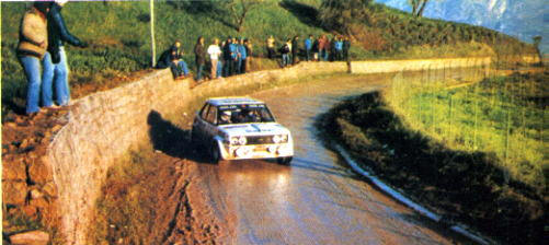 | Subito dopo sbatte con il muso contro lo spigolo dello scarico d'acqua su cui è in piedi lo spettatore nella foto grande. Subito dopo Vudafieri e il suo navigatore « Piemme » saltano giù dall'auto doloranti il primo al ginocchio sinistro e l'altro al piede destro. « Piemme » si rivolge a noi dicendo: — Forza ragazzi toglietela di mezzo e fate rallentare gli altri —, poi si allontana zoppicando insieme a Vudafieri verso la fine prova. |