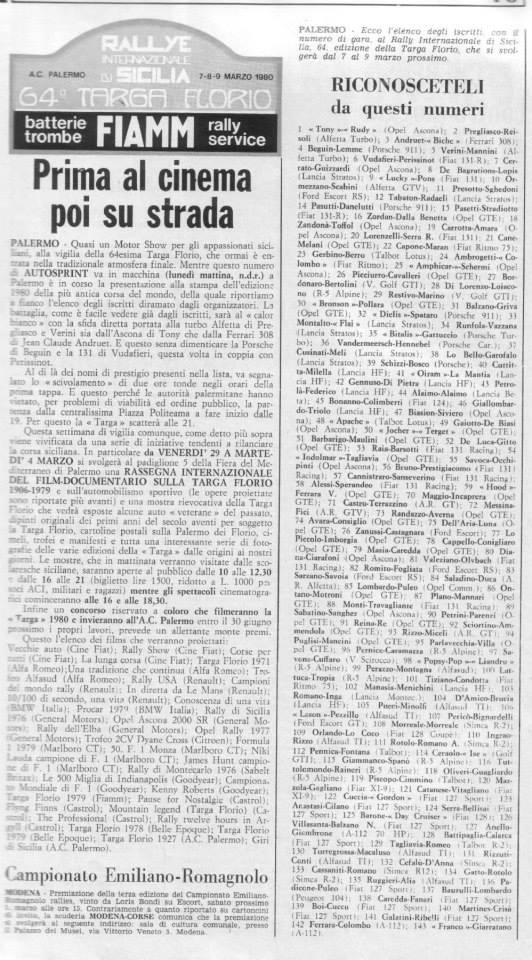 ![]() | Ritorna in Sicilia il francese ANDRUET «Cavallo pazzo» si accolla questa lunga trasferta per saggiare la qualità della Ferrari 308 GTB di Michelotto. «L'assaggio» è stato ottimo, se si pensa che il francese stava dominando il rally, prima di doversi ritirare per un principio di incendio al motore. |