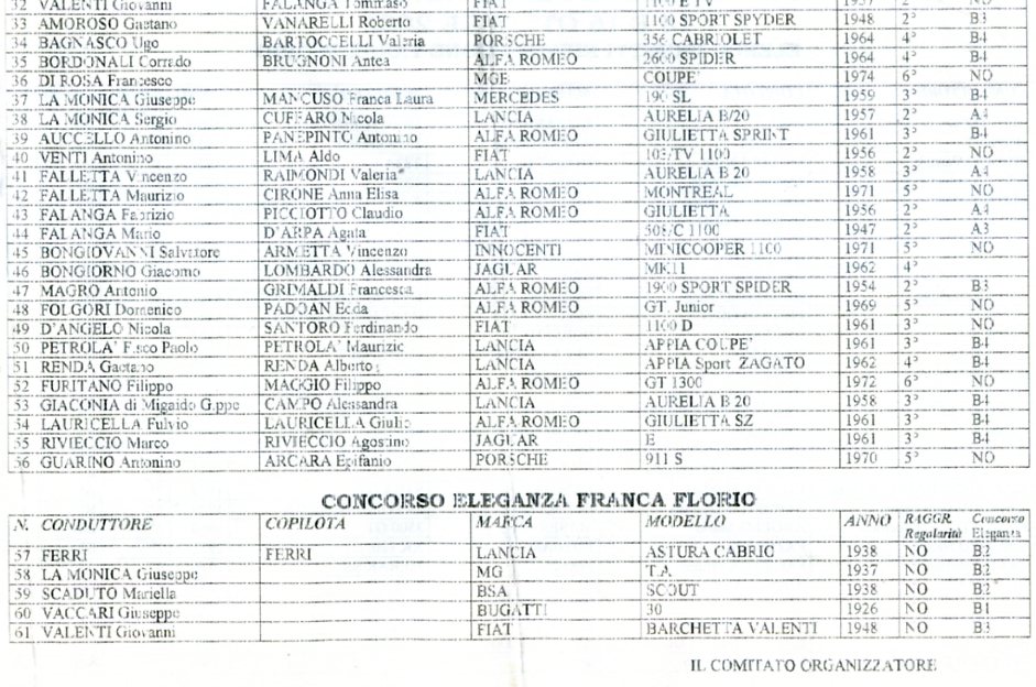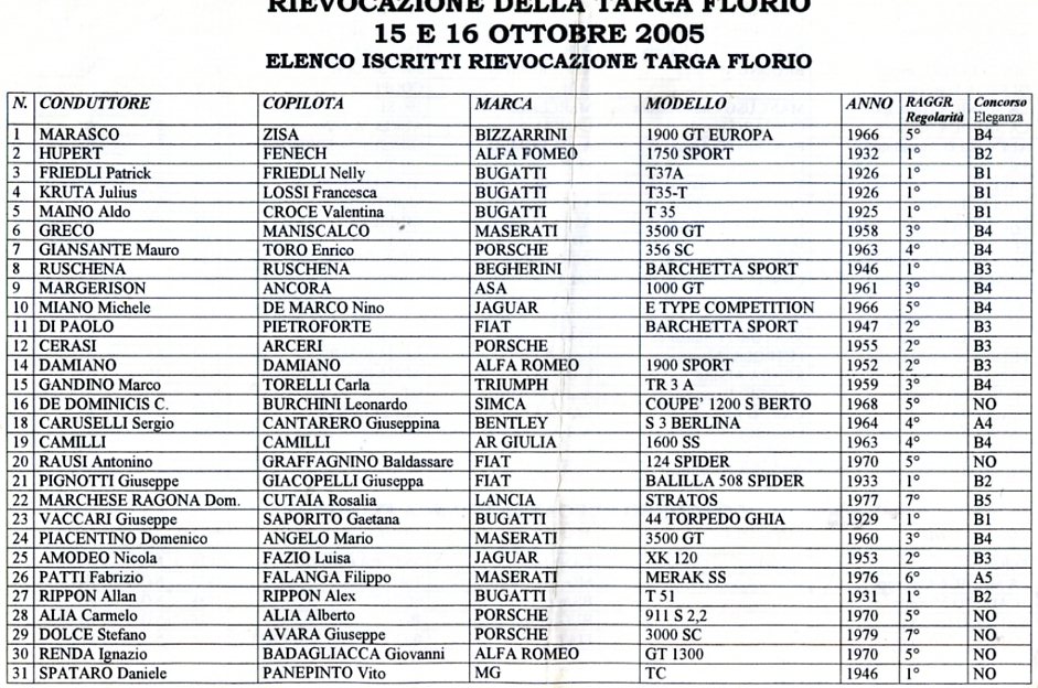 | I 32 equipaggi partecipanti alla Targa Florio AUTOSTORICHE 2005 affronteranno domani mattina a Cefalů la sessione loro dedicata di verifiche sportive e tecniche . Favorite in questa gara sono le le Porsche di Billa, vincitore tra le AUTOSTORICHE lo scorso anno, Rizzuto, Picciurro, e Filippone, le Lancia Stratos del sanmarinese Bianchini e di La Barbera, la BMW 2002 di Savioli, l’Opel Ascona 400 di Altopiano, la Fiat 125 di Savoca, l’Opel KADETT GTE di Vazzana e l’Escort di Rizzo. |