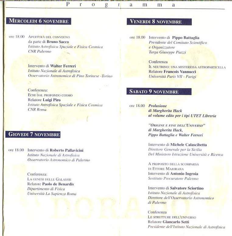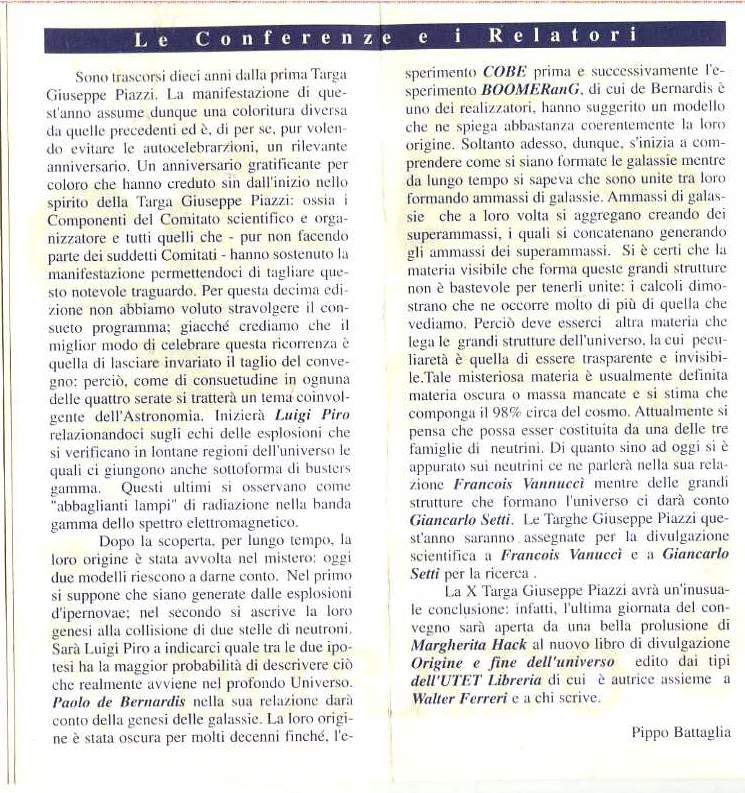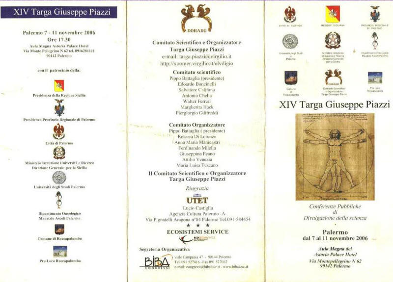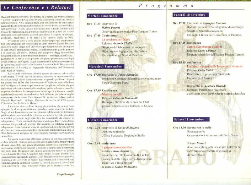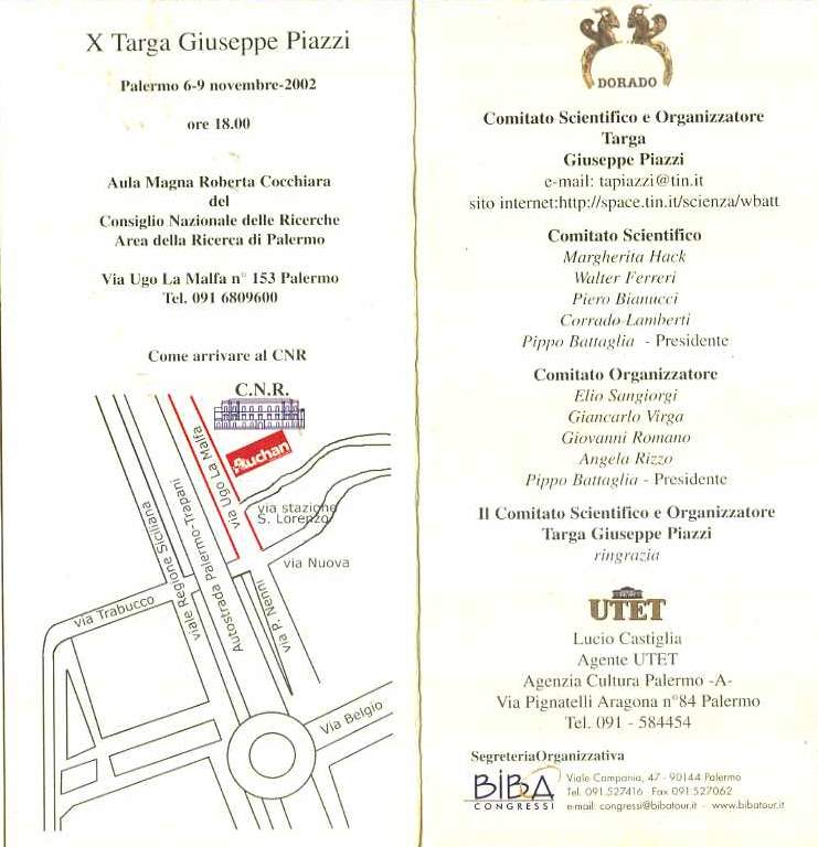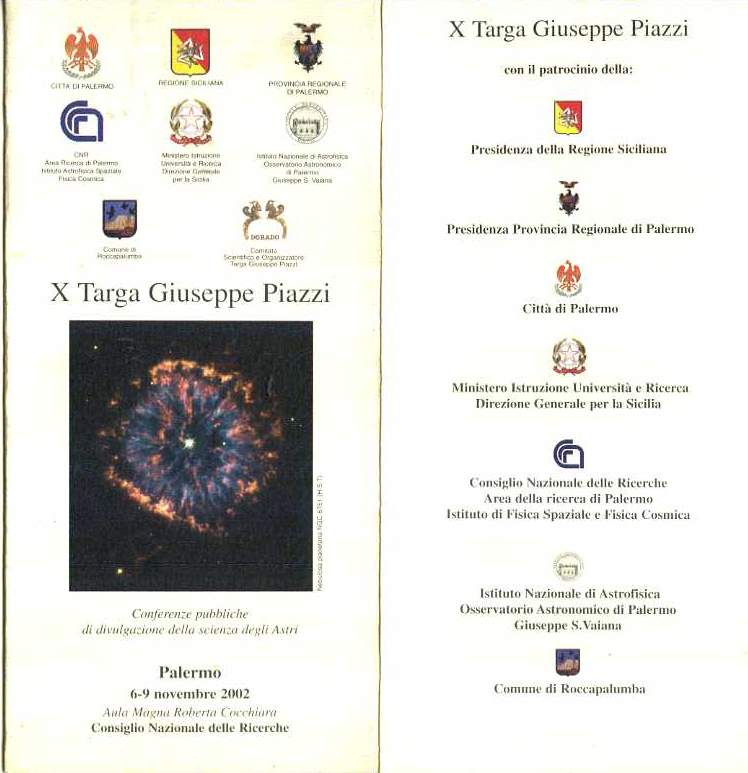 | Considerata come la Targa Florio dello Spazio, la Targa Giuseppe Piazzi, fondata nel 1993 da Pippo Battaglia, è un premio simbolico che si assegna annualmente a Palermo, nel mese di novembre, al ricercatore che nel corso degli anni si è distinto in ambito scientifico e al giornalista o scrittore oppure allo scienziato che più degli altri eccelle nella divulgazione della scienza. Il premio e il convegno, intitolato all'astronomo valtellinese Giuseppe Piazzi, soprattutto si prefigge di ricordare la scoperta del primo asteroide compiuta, per l'appunto, da Giuseppe Piazzi il 1º gennaio del 1801 dall'Osservatorio Astronomico di Palermo da egli stesso fondato. E sottolinea anche l'alto valore della ricerca nell'ambito dell'astronomia di cui fu artefice per lungo tempo l'astronomo valtellinese. Piazzi, in onore della Sicilia, denominò Cerere Ferdinadea il corpo celeste da egli scoperto. |