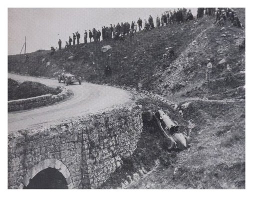 | 22^ TARGA FLORIO 10 maggio 1931 La MASERATI di RENE' DREYFUS, poi costretto anche lui al ritiro, passa sul luogo dell'incidente, senza gravi conseguente, di BIONDETTI anch'esso su MASERATI |