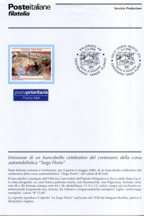 2006. Bollettino Illustrativo POSTE ITALIANE per l'emissione di un francobollo celebrativo del centenario della corsa automobilistica Targa Florio