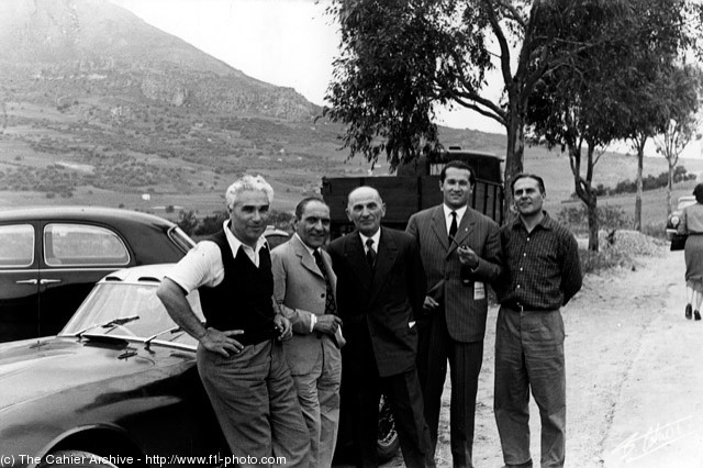 | 1953 37^ Targa Florio, eccolo (ultimo a dx) con (da sx) Taruffi, Bonetto, l'ing. Jano e Maglioli. |