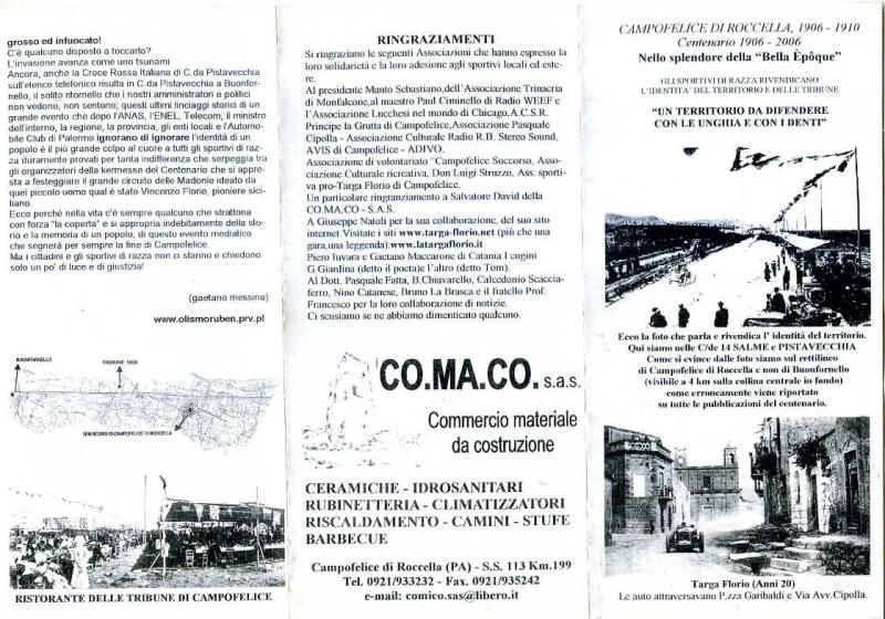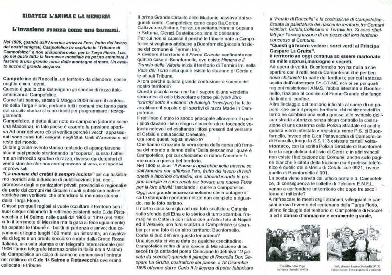 | RIDATECI L'ANIMA E LA MEMORIA L'invasione avanza come uno tsunami. Nel 1906, quando dall'America arrivava l'oro, frutto del lavoro dei nostri emigrati, Campofelice ha ospitato le "Tribune di Campofelice" e non di Buonfornello, per la Targa Florio. Luogo nel quale tutta la kermesse mondiale ha potuto ammirare il : fascino di una grande corsa dalle montagne al mare. Un evento anche di grande eleganza. Campofelice di Roccella, un territorio da difendere, con le unghia e con i denti. Questo è quello che sostengono gli sportivi di razza italo-americani di Campofelice. Come tutti sanno, sabato 6 Maggio 2006 ricorre il centenario della Targa Florio, pertanto tutti i comuni che fanno parte del circuito storico si sono riuniti per programmare i festeggiamenti. Campofelice, a detta di un noto ex-campione (adorato come una Madonna), in tale paese è assente la passione sportiva. Ad onor del vero ciò si verifica perché i vecchi appassionati sono quasi tutti emigrati negli Stati Uniti d'America e nel resto del mondo. Di tale grande evento stanno tentando di appropriarsene alcuni capi popolo strattonando la "coperta", questo l'afferma un inferocito sportivo di razza, diverso dai detentori di verità storiche che non corrispondono al vero, e di sportivi improvvisati. "La mamma dei cretini è sempre incinta" per cui assistiamo inorriditi alla diffusione di pubblicazioni, libri, ecc... promosse dagli organizzatori privati, provinciali e regionali e da parte dei comuni del circuito i quali pubblicano notizie storiche non veritiere, che offendono la memoria storica della Targa Florio. Chissà per quali ragioni si vuole occultare il territorio con i suoi cinque chilometri di rettilineo esistenti nelle C.de Pistavecchia e 14 Salme, nelle quali dal 1906 al 1910 (nel 1908 ci fu il terremoto di Messina ma la gara si fece ugualmente) ha ospitato le tribune e i bolidi di partenza e arrivo; due capannoni di legno lunghi 180 metri, un ristorante, un cavalcavia di legno e un pronto soccorso curato dalla Croce Rossa Italiana, una sala stampa e un telegrafo internazionale (nel 1906 l'unico telegrafo internazionale in Italia era a Milano) da Campofelice un colpo di cannone annunciava l'entrata nel rettilineo di C.de 14 Salme e Pistavecchia ove erano collocate le tribune. Il primo Grande Circuito delle Madonie passava dai seguenti centri: Campofelice come capo fila. Cerda, Caltavuturo,Scillato,Polizzi,Castellana,Petralia Soprana e Sottana, Geraci, Castelbuono, Isnello, Collesano. Per cui non si capisce il perché le tribune nate a Campofelice si vogliano attribuire a Buonfornello (piccola frazione del comune di Termini Imerese) A dividere il territorio è il Fiume Grande, confinante con quattro case di Buonfornello, ove esiste Himera e il Tempio della Vittoria inizia il territorio di Termini Imerese nella Valle del Torto nella quale esiste la stazione di Cerda e le attuali Tribune. Allora perché questa grande confusione a scapito del nostro territorio? Questa piccola cosa che ha il sapore di una vendetta stracarica di odio trisecolare e forse più (vedi libro "principi sotto il vulcano" di Raleigh Trevelyan) ha fatto arrabbiare il popolo e gli sportivi di razza Made in Campofelice. Il rettilineo è stato lo snodo principale attraverso il quale i piloti davano libero sfogo all'acceleratore toccando velocità notevoli ed esaltando i tifosi presenti dal versante di Cefalù e dalla Sicilia Orientale. Chi sono questi registi invisibili? Che hanno strozzato la vera storia della corsa più famosa del mondo a danno della "Bella senz'anima" quale è Campofelice, per cui chiediamo di ridarci l'anima e la memoria a questo bel territorio. Nel 1900 si dice: "Il Paese languirebbe nella miseria se dall'America non affluisse l'oro, frutto del lavoro dì tanti onesti e laboriosi contadini, che abbandonando le proprie famiglie si sono recati per trovare una nuova Terra per la loro attività" lasciando il cuore a Campofelice. Oggi con grande amarezza notiamo che montagne di carte stampate riportano notizie non complete a riguardo, ma le foto parlano. Il nostro caso somiglia ad una foto scattata a Catania sullo sfondo dell'Etna e lo storico di turno scambia l'immagine di Catania con l'Etna con un'altra foto di Napoli ed il Vesuvio, una foto scattata a Campofelice si scambia per una foto di un altro territorio: Buonfornello. Come si può definire questo fenomeno? Una risposta ci viene data da qualche concittadino. Campofelice soffre di una specie di Maledizione di tre secoli fa (a detta del poeta Cirincione lo definiva "U piccata da scecca") quando il principe di Roccella Don Gaspare La Grutta, costruttore del paese, il 18 Dicembre 1699 ottenne dal re Carlo II la licenza di poter fabbricare il "Feudo di Roccella" e la costruzione di Campofelice -fissata la palettatura del nascente territorio, tre Comuni viciniori: Cefalù, Collesano e Termini Imerese. Si sono ribellati per rassegnazione di un pezzo del loro territorio concesso al Comune. "Questi gli fecero vedere i sorci verdi al Principe Gaspare La Grutta". I! territorio ad oggi continua ad essere martoriato da mille soprusi,menzogne e segreti. Ad opera di verità, Buonfornello non ha nulla a che spartire con il rettilineo di Campofelice che per ben nove chilometri fa parte del territorio; per cui la stessa uscita dell'autostrada PA-CT-ME non si sa per quali ragioni misteriose l'ANAS, l'abbia intestata a Buonfornello, frazione al confine col Fiume Grande che funge da limite di confine. Altro linciaggio del territorio inficiato al cuore di un popolo, che ama il proprio territorio, dal ministero dell'interno,ne combina una molto grossa: allo svincolo dell'autostrada autorizza senza alcun controllo la costruzione di una caserma della Polizia Stradale ed anche questa viene intestata e registrata come P.S. di Buonfornello, invece che C.da Pistavecchia di Campofelice di Roccella, lungo la S.S.113 esistono cartelli voltastomaco, con la scritta Polizia Stradale di Buonfornello e la segnaleti