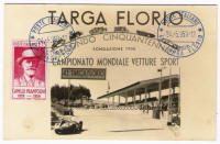 | X | | |  | | Ieri, Oggi, Domani con scritto: «La più vecchia Targa del mondo dovrà sopravvivere finché rullerà l'ultimo motore». Arrivederci Targa! A Cerda il prossimo appuntamento» Tir. 500 pz. Circolo Filatelico Numismatico di Termini Imerese col. |