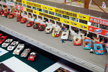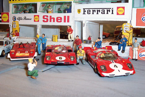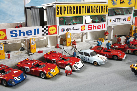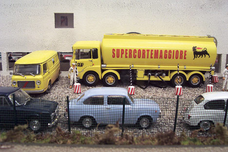 ![]() | I modelli, veri protagonisti del diorama, sono di tutti i tipi e di tutte le marche: per esempio, l'autobotte Agip collocata alle spalle delle tribune è stata comperata in un centro commerciale e completamente rifatta. Il telaio è stato accorciato, la cabina, in origine Scania, è stata modificata per renderla simile a quella della motrice Fiat "690". La bisarca Porsche per il trasporto di quattro "908/3" è composta da oltre 200 pezzi e prevede persino due cuccette e il cruscotto. In primo piano, una Fiat "850" e una Fiat "600" della serie "Hachette" per le edicole. L'autobotte Fiat è un modello Teama in plastica, accorciato nel telaio e con cabina radicalmente modificata. |