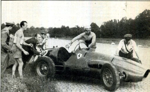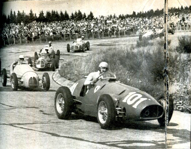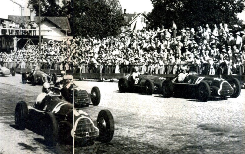 ![]() | 1950. Al Bermgartnen di Berna si corre Il gran premio di Svizzera, terzo della stagione dopo Silverstone e Monaco. A sinistra le prime due file della griglia di partenza: Fangio (n. 14), Farina (16), Ascari (18) e Fagioli (12). La corsa è un monologo Alfa: l'unico brivido è il ritiro di Fangio, che da via libera a Farina, primo davanti all'altro alfista Fagioli. Gli altri piloti sono tutti doppiati! Fangio vince i successivi gran premi del Belgio e di Francia. Decisiva è l'ultima corsa, in programma a Monza: Fangio si ritira, Farina vince e si laurea primo campione del mondo di formula uno. E pensare che a 20 anni, per racimolare i soldi necessari all'acquisto di un'auto tipo «sport», giocava in Borsa i risparmi messi da parte lavorando nella carrozzeria del padre a Torino. |