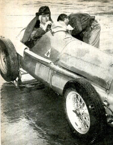 ![]() | ... eccolo risalire sulla Ferrari dopo un'uscita di pista alla curva di porfido a Monza, nelle prove del G. P. d'Italia. |