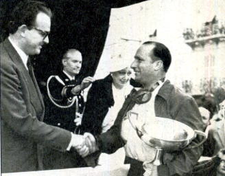 ![]() | 1950. Il principe Ranieri di Monaco premia l'argentino Manuel Fangio, vincitore su Alfa del gran premio di Montecarlo. Decisivo Il primo giro: alla curva del Tabaccaio Farina e Fagioli vanno In testacoda e si ritirano. Manuel Fangio, invece, evita l'ingorgo e vince. |