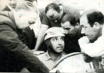 ![]() | ... Enzo Ferrari ascolta le impressioni di Ascari durante alcune prove. Dietro, a capo chino, c'è Gonzales. |