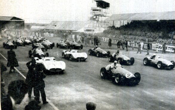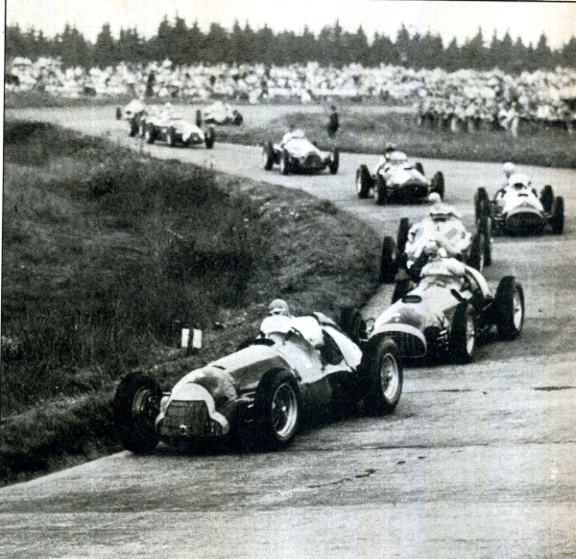 ![]() | 1954. Il campione del mondo di Formula 1 Alberto Ascari, passato alla Lancia, torna in pista solo nel gran premio di Francia, terza corsa stagionale La Lancia non è più in grado di mettere a punto una monoposto competitiva per il 1954 e lascia libero Ascari di correre In Francia con una Maserati e, a Monza, con una Ferrari. L'argentino Manuel Fangio vince sei gran premi (due su Maserati e quattro su Mercedes) laureandosi campione del mondo per la seconda volta consecutiva. A sinistra la partenza del gran premio di Gran Bretagna, a Silverstone, vinto dalla Ferrari dell'argentino Gonzales. |