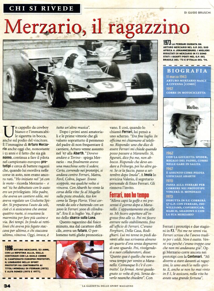 | Arturo Merzario, definito il "Fantino" per il fisico esile, si rimprovera di non essere riuscito a domare la 312 B3 "Spazzaneve", la più bizzosa fra le monoposto di Maranello, e attribuisce a questo la rottura con Ferrari. In effetti, nessuno riuscì a mettere in riga quel Cavallino recalcitrante. Ma ciò non consola il Fantino, che in ogni modo è considerato uno dei migliori piloti di Sport. Nato l'11 marzo 1943 a Civenna (CO), debuttò nel 1963 con un'Alfa Romeo Giulietta Spider. L'anno dopo acquistò una Fiat - Abarth 1000 e vinse molto in salita, in pista e all'estero. Dopo il servizio militare continuò con l'Abarth 1000, qualificandosi come uno dei migliori interpreti del modello e diventando vice campione nell'Europeo Turismo '67. Ciò gli aprì le porte dell'Abarth, per la quale guidò ufficialmente dal 1968 al 1971 conquistando il Campionato Italiano '68 e l'Europeo della Montagna '69. Nel 70 passò alla Ferrari, ma corse pure con la Tecno F2 e l'Abarth Sport. Nel 1972, vinse l'Europeo Marche 2000 con l'Abarth - Osella, s'aggiudicò la Targa Florio e la 1000 km del Nürburgring con la Ferrari 312 P e debuttò in Formula 1 sostituendo Regazzoni sulla Ferrari 312 B2 nel G.P. d'Inghilterra, dove si classifico sesto. Passò quindi alla Iso - Ford nel 73, pur continuando con le Sport. Nel '75 corse in Formula 1 con una Williams e una Coper-sucar. Nel '76 e nel '77 guidò una March F1, tranne nel G.P. d'Austria '77 dove guidò una Shadow. Nello stesso anno diede una mano all'Alfa Romeo per la conquista del Mondiale Sport. Nel '78 e '79 pilotò una Formula 1 di sua costruzione, ma problemi finanziari ne limitarono il rendimento. Dopo la parentesi non proprio felice, Merzario tornò alle Sport diventando un vero specialista della categoria, molto ricercato dai costruttori. L'attività agonistica di Arturo non è finita. A quarant'anni dal debutto è facile incontrarlo in pista come pilota o ai bordi a guardare le corse con la passione della prima volta. |