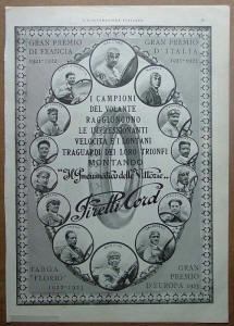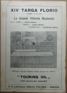 | 1923. Il telegramma dell'Ing. Rimini dell'Alfa Romeo alla Foltzer di Genova per informare che anche grazie al TOURING OIL si è vinta la 14^ Targa Florio, diventa pubblicità per la Casa di lubrificanti Italiana. (da l'Illustrazione Italiana) | ![]() | 1923. La Pirelli punta logicamente su i suoi campioni. |