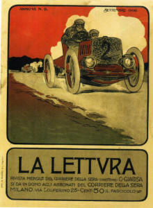 | 1906. LA LETTURA rivista mensile del Corriere della Sera del settembre 1906 dedica la copertina alla Targa Florio, è il primo esempio di pubblicità alla nuova creatura di Vincenzo Florio. |