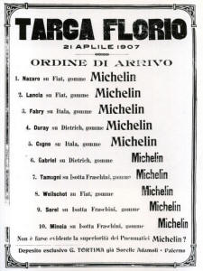 | 1907 La FIAT coglie l'occasione della vittoria nella 2^ Targa Florio e si pubblicizza così nella rivista Le Vie d'Italia del T.C.I. | ![]() | 1907. Il Deposito esclusivo G. TORTIMA già sorelle Adamoli di Palermo reclamizza i sui prodotti che altro non sono che le gomme MICHELIN riportando un ordine di arrivo veramente impietoso.