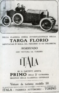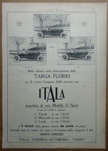 | 1921. La copertina della Rivista Automoto Ciclo dà risalto alla squadra Alfa Romeo (Campari, Ferrari e Sivocci) e ai Pneumatici Pirelli per la partecipazione nella 12^ Targa Florio. | ![]() | 1921. L'ITALA, sull'Illustrazione Italiana, comunica che ha piazzato tre sue vetture di serie nei primi 12 di categoria a solo "8 minuti dalla grossa vettura da corsa vincitrice" che per la cronaca ricordiamo essere la "concorrente" FIAT 4500 di Giulio Masetti, effettivamente una F1 dell'epoca e non certo alla portata della comune clientela.