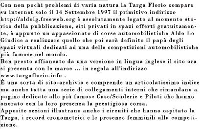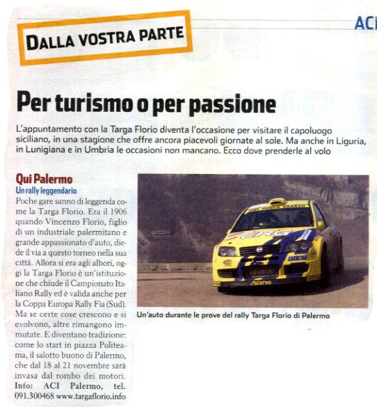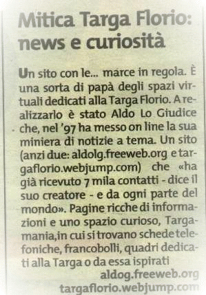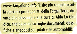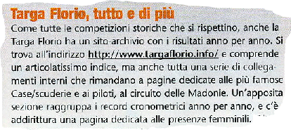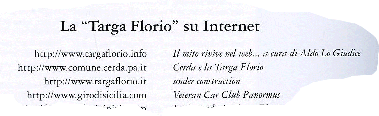 | Una canzone per l' uomo che inventò il rally Repubblica — 17 aprile 2002 pagina 9 sezione: PALERMO cartoline per collezionisti Quasi ogni anno, in concomitanza con la Targa Florio, vengono emesse cartoline postali da collezione. Esistono anche numerosi annulli filatelici e francobolli emessi anche da paesi stranieri Tra i più apprezzati, la serie di San Marino emessa negli anni Sessanta poster e gadget Molto ricercati dai collezionisti anche i poster delle varie edizioni della Targa Questa è la Porsche scelta per l' edizione del lontano 1967. Naturalmente vanno a ruba anche filmati d' epoca, fumetti, cartelloni pubblicitari. Una collezione telematica nel sito www.targaflorio.info i quadri d' autore La Targa Florio ha ispirato numerosi artisti italiani e stranieri che hanno dipinto le auto mentre sfrecciavano lungo i sinuosi tornanti del circuito delle Madonie. Numerose opere sono contenuto nel sito internet http://www.targaflorio.info il primo vincitore Un reperto storico di immenso valore La foto di Alessandro Cagno che nel 1906 vinse la prima edizione della Targa Florio a bordo di un' Itala che coprì i 446,469 chilometri del percorso in poco più di 9 ore e mezzo alla media di 46,500 chilometri orari Una canzone dedicata a Vincenzo Florio (nella foto), l' uomo che è riuscito a fare vivere un sogno rendendolo realtà e mito. L' ha scritta Filippo Licata e sarà contenuta in un cd finanziato dal Comune di Cerda. Il titolo è "Il sogno di un uomo". Ecco il testo: «Questa è la terra del fuoco e del mare dove tutto è colore e cita, è un cielo, sono occhi dove ti perdi, è un sogno diventato realtà. È l' alba è proprio qua pensò Vincenzo, i sogni di un uomo diventano veri tra gli altri sogni. La vita lenta inizia a correre, le strade sono piede di emozione, di rombi veloci nel silenzio antico, pazzi tra polveri e ali di folla. È la mitica Targa Florio, i campioni volano tra mille curve e se pensi che hanno paura non credi che siano uomini. Spirito del mondo, tu da sempre ci sei, porta con te la mia fantasia. Dove nascono i pensieri prendi l' anima e falla volare via. Angeli volano veloci e ascoltano il motore col cuore come fosse una donna per un giorno di felicità. Un sorpasso e poi un altro ancora, sfrecciano come fulmini, sfidano la morte e poi li vedi piangere dopo la vittoria. Le mani che si alzano. La notte è scesa e siamo andati via. La corsa di Vincenzo, il suo sogno vola ancora sulle strade aspettando d' essere realtà». |