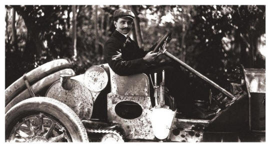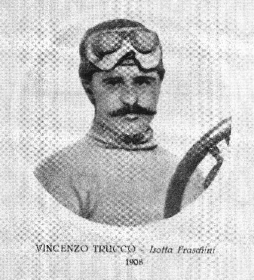 Un compiaciuto VINCENZO TRUCCO posa per la foto ufficiale sulla sua ISOTTA FRASCHINI dopo aver vinto alla media di quasi 60 all'ora, la 3^ TARGA FLORIO del 1908.