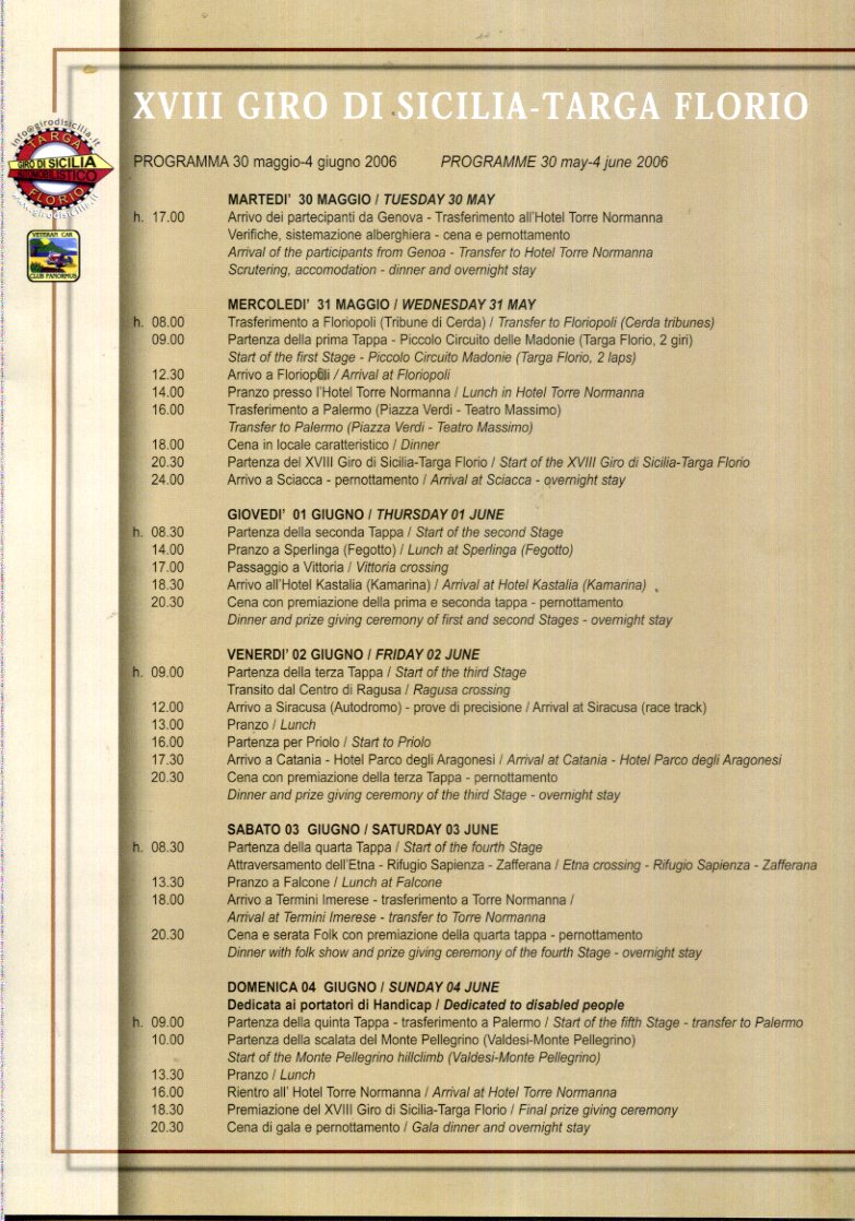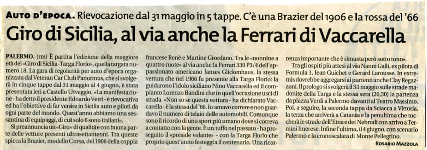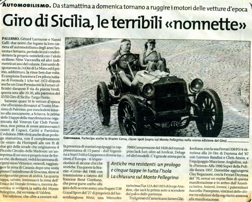 | PALERMO. Sono state 47 le vetture che ieri mattina, hanno partecipato al prologo del XVIII Ciro di Sicilia - Targa Florio, la manifestazione di regolarità per auto d'epoca che ha preso ufficialmente il via alle 20.30 di ieri (con la partenza da Palermo, in piazza Verdi), per completare la prima tappa a Sciacca. Scenario dello start sono state le Tribune di Cerda, con l'accoglienza musicale della banda dell'Associazione Musicale «Giuseppe Verdi» e del Gruppo Majorette di Vìllaurea di Termini Imerese. Solo un'anteprima dell'evento vero e proprio, che vedrà aggregarsi anche i due campioni del passato Gerard Larrousse e Nanni Galli, e altri ospiti di assoluto riguardo che eleveranno ad oltre cinquanta unità l'elenco degli iscritti a questa edizione della gara. Oggi la seconda delle cinque tappe, che vedrà la carovana delle «nonnine a quattro ruote» dirigersi proprio da Sciacca, prima nei pressi di Chiaramente Gulfi e, quindi, di Vittoria con l'arrivo a Kamarina, dove sarà stilata una prima classifica provvisoria in base ai tempi realizzati dai concorrenti nelle varie prove di abilità previste con «crono» imposto. (da il GdS del 1/06/2006). |